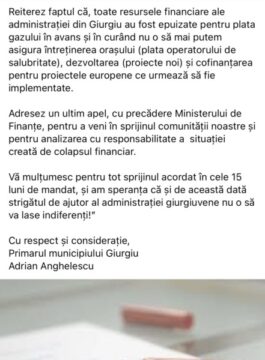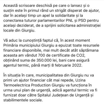 Într-o zi de sâmbătă, exact cum aţi auzit, primarul oraşului Giurgiu trimitea o scrisoare deschisă Guvernului, Ministerului Finanţelor dar şi parlamentarilor PNL şi PSD, prin care îşi exprimă imposibilitatea platii agentului termic după ziua de marţi a următoarei săptămâni, solicitând ajutor guvernamental.