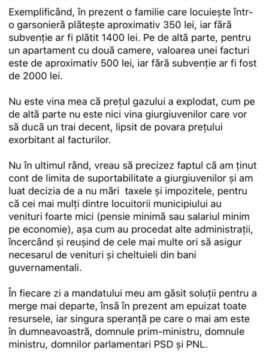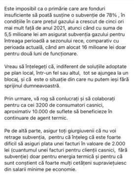 Dacă domnul primar îşi făcea datoria înainte, şi rezolva probleme fundamentale, nu se mai ajungea în imposibilitatea de plată a facturilor şi nu recurgea la strigătul de ajutor cu doar 72 h înainte de sistarea agentului termic.